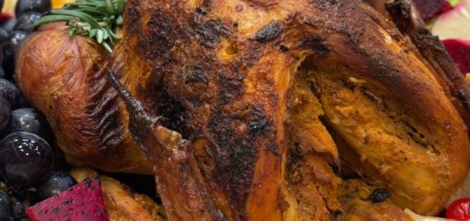 Ingredientes: Peru Suco de 2 copos de laranja Mix de temperos secos Passas Azeitonas Para decoração: Uva, abacaxi, pitaia, ameixa, cereja, alecrim Modo de preparo: Em um recipiente grande, coloque o peru e tempere...