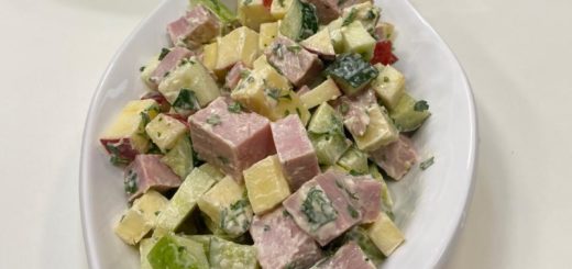 Ingredientes: Salada fria Presunto suíno Queijo Pepino japonês Maçã verde Maçã vermelha Salsinha picada Maionese Modo de preparo: Cortada tudo em cubos e bota um pouco na geladeira antes de servir