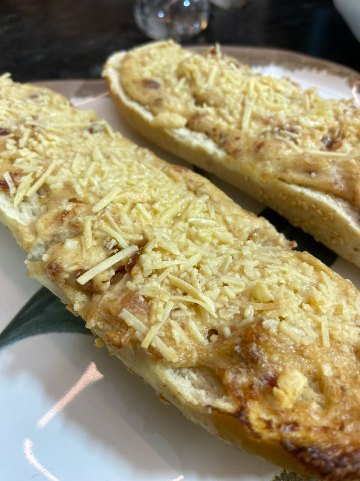 Faça cortes no pão e coloque a mistura entre elas. Finalize com a mistura em cima e polvilhe mais queijo e leve por 2 minutos na ayr fryer.