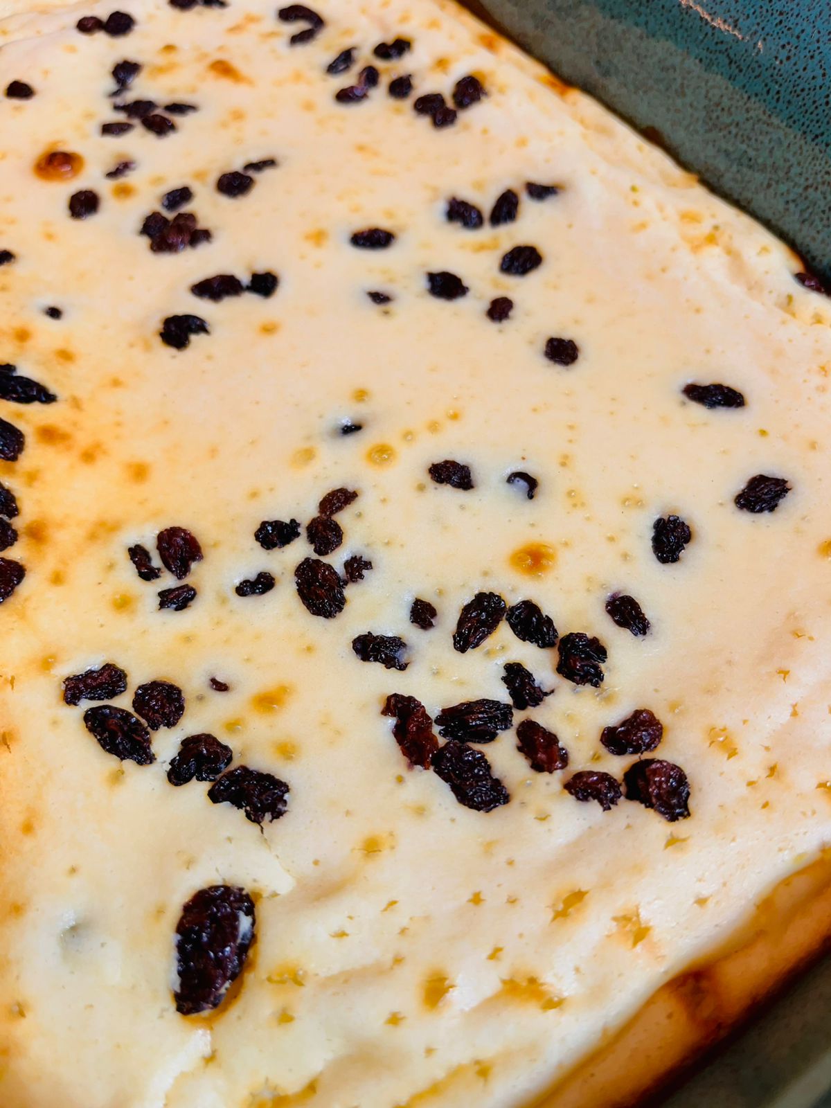 Reserve as uvas passas. Em um copo de liquidificador, junte todos os ingredientes e bata até formar uma massa homogênea. Coloque esta massa em uma tigela e junte as passas. Misture uniformemente. Unte uma forma retangular somente com a manteiga. Leve para assar em forno pré-aquecido a (180 graus) por uns 40 minutos. Não se assuste, pois ela cresce bastante e depois abaixa. Deixe esfriar, corte em pedaços e coloque em um prato grande para servir. Se preferir asse em forma refrataria decorada.