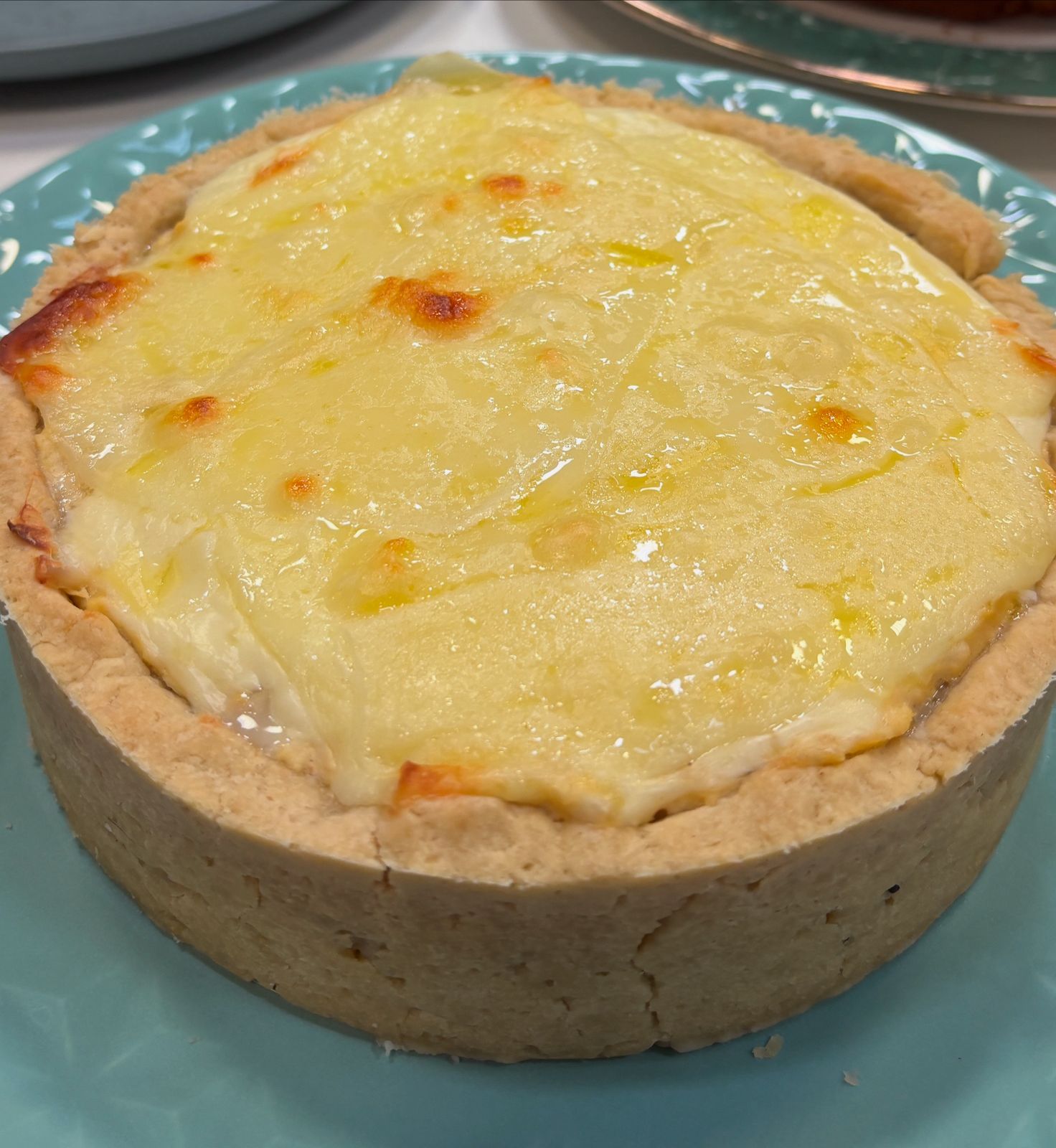 – Monte a torta: massa, recheio cremoso e bastante queijo mussarela por cima.