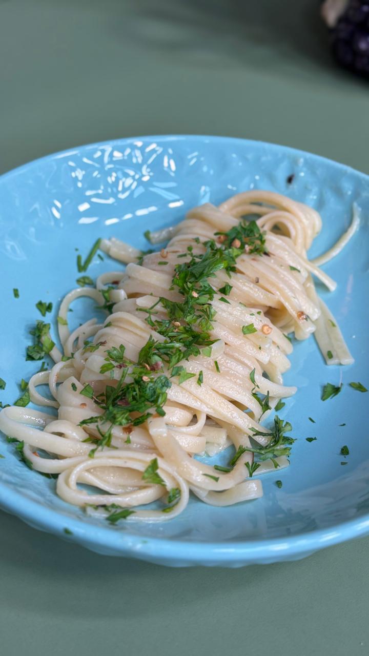 Coloque-os em um recipiente com meia concha da água do cozimento da massa e meia concha da água do cozimento do alho.