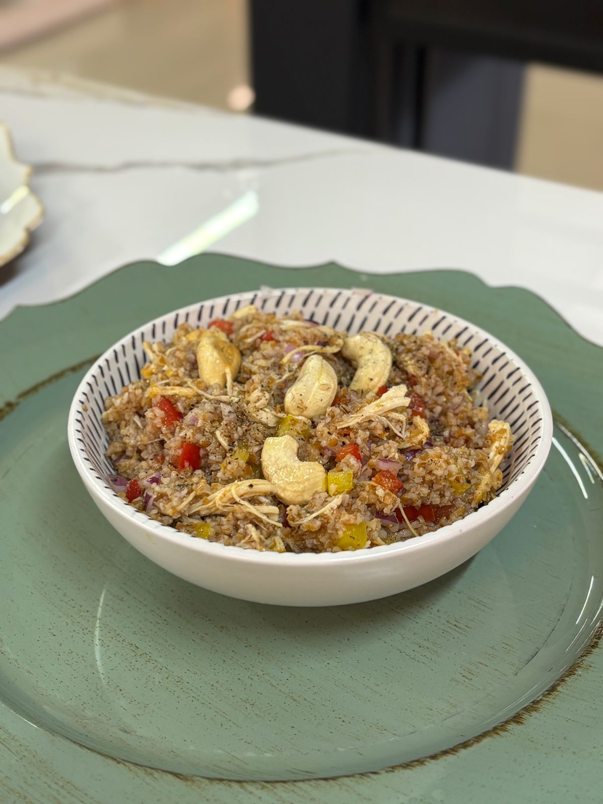 • 500g de trigo para kibe • Cebola roxa picada • Pimentão vermelho picado • Tomate picado • Azeite • Sal • Salsinha picada • Pimenta a gosto Modo de preparo: 1. Hidrate o trigo para kibe com água até ele dobrar de tamanho. 2. Acrescente o tomate, a cebola roxa, o pimentão e a salsinha, tudo bem picadinho, e misture. 3. Tempere com azeite, sal e pimenta a gosto.