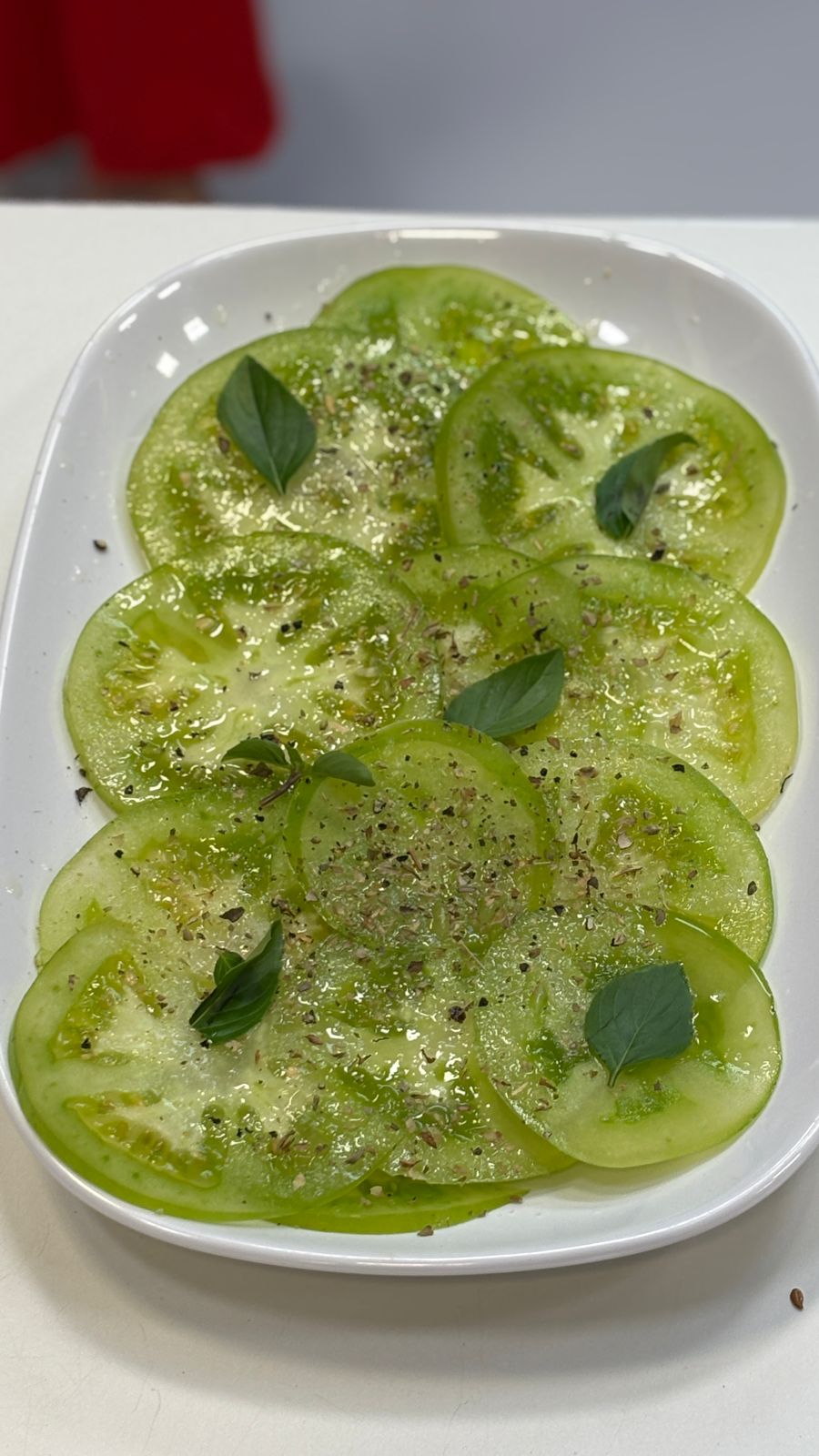 – Em um prato raso distribua as fatias de tomate verde, tempere com limão, sal, pimenta e azeite.