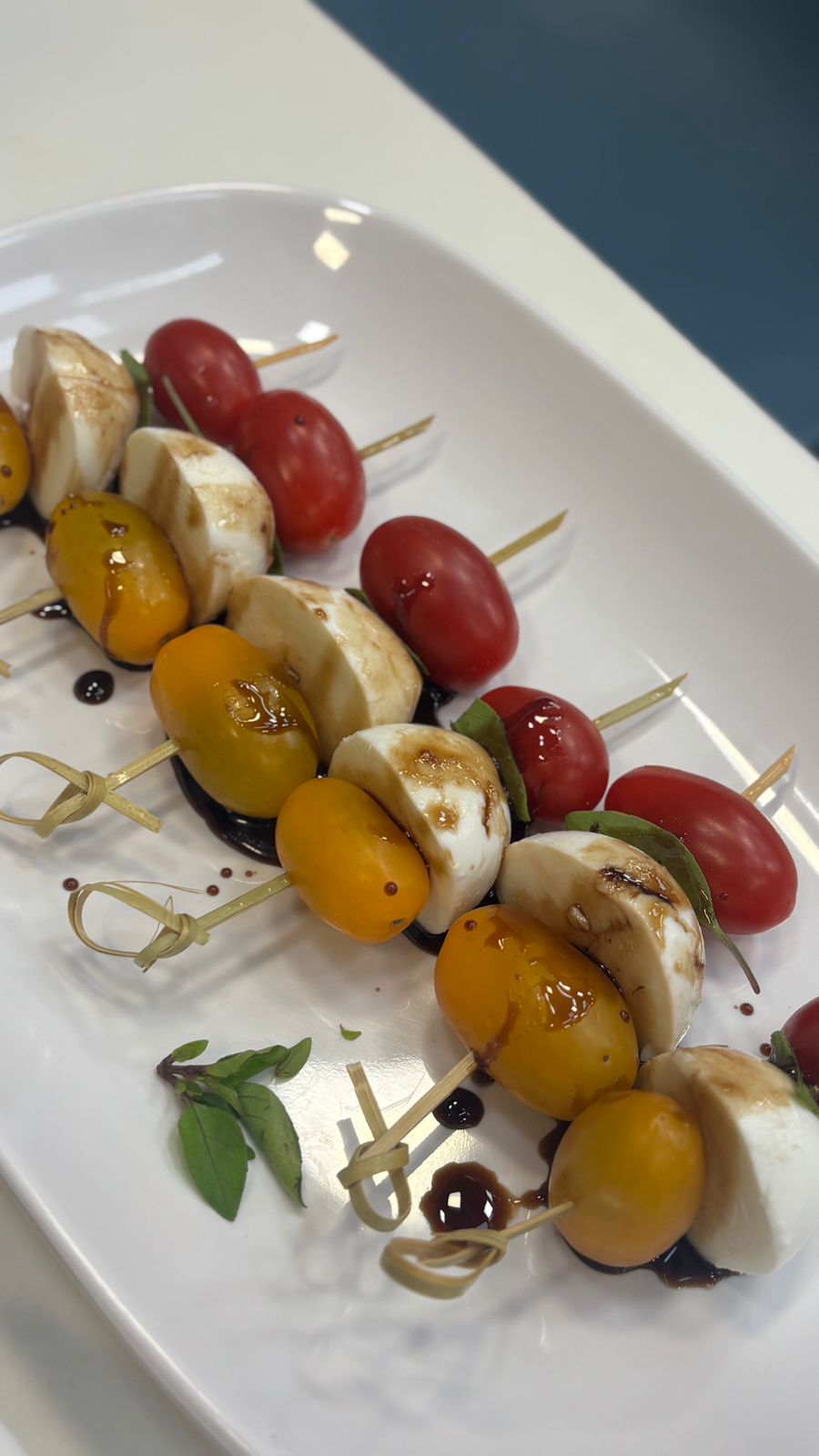 Para preparar os espetinhos,intercale o tomate, a mussarela, manjericão e finalize com tomate.