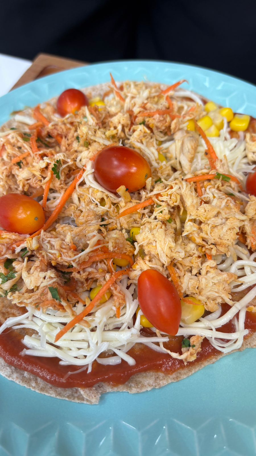 Misture o frango desfiado com a cenoura, o milho e o molho de tomate e 1 colher de requeijão