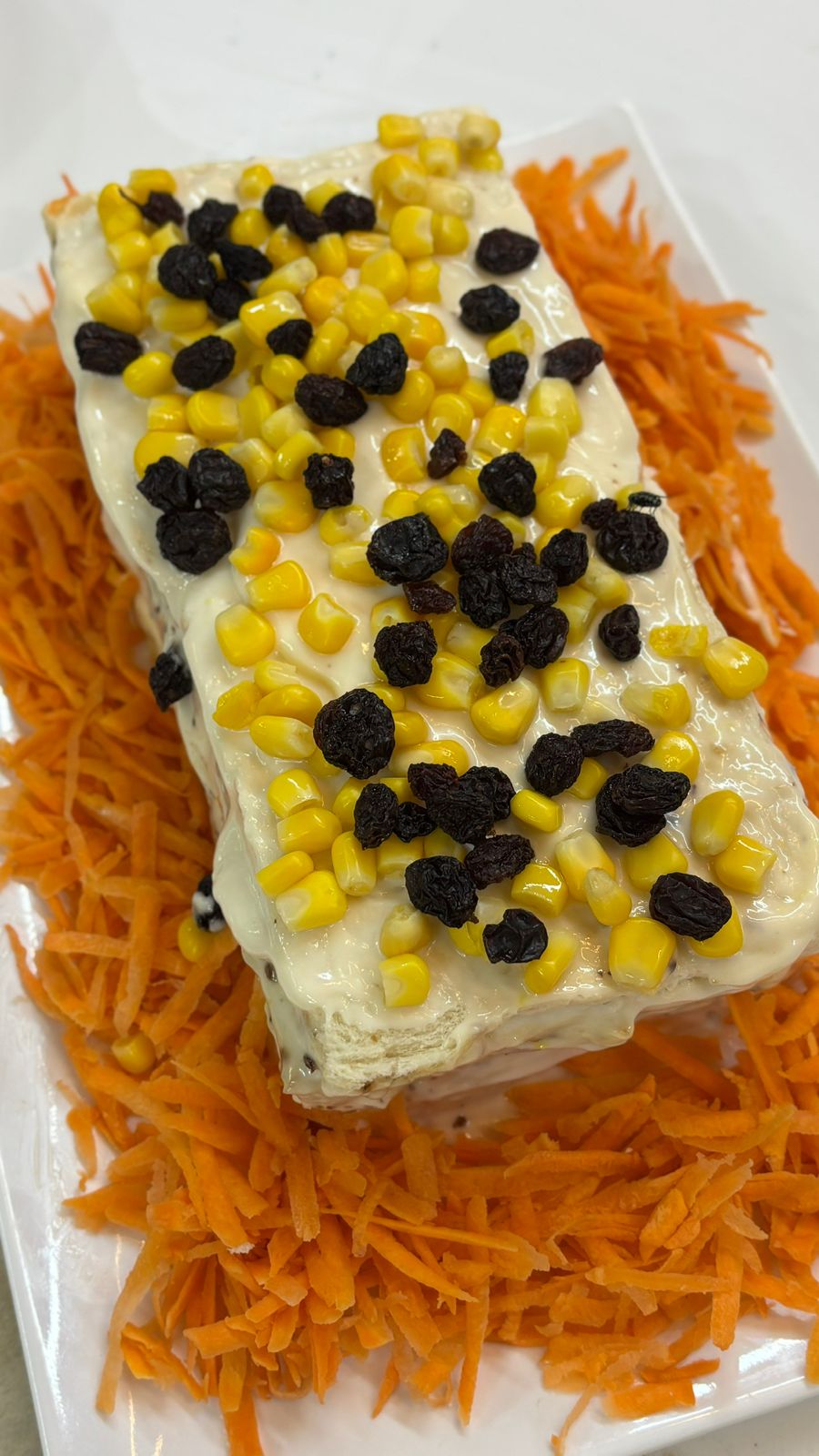Por fim, passe um pouco de maionese com creme de leite sobre a camada final, raspe um pouco de cenoura, queijo ou batata palha.