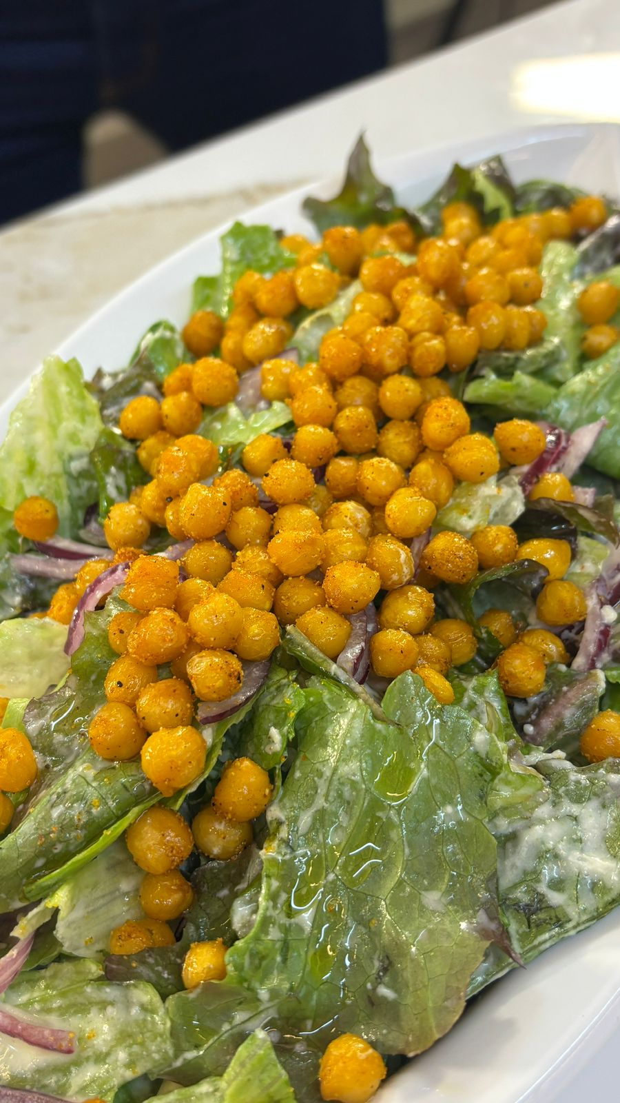 Em um bolw misture as folhas de alface, cebola roxa. Misture o molho e finalize com grão de bico.