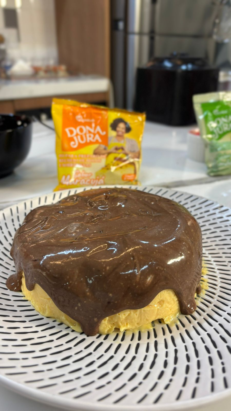 No liquidificador, coloque o leite condensado, o creme de leite, o pó sabor maracujá, o leite em pó e o chocolate branco derretido, e bata bem. Forre uma forma com papel filme, ou use uma forma de silicone, e despeje a mousse que esta no liquidificador. Leve para o freezer. Depois de 2 horas, retire do freezer e desenforme em um prato. Derreta o chocolate ao leite e adicione o creme de leite, formando uma ganache. Finalize a mousse colocando a ganache em cima. Leve a geladeira para a ganache encorpar, depois sirva
