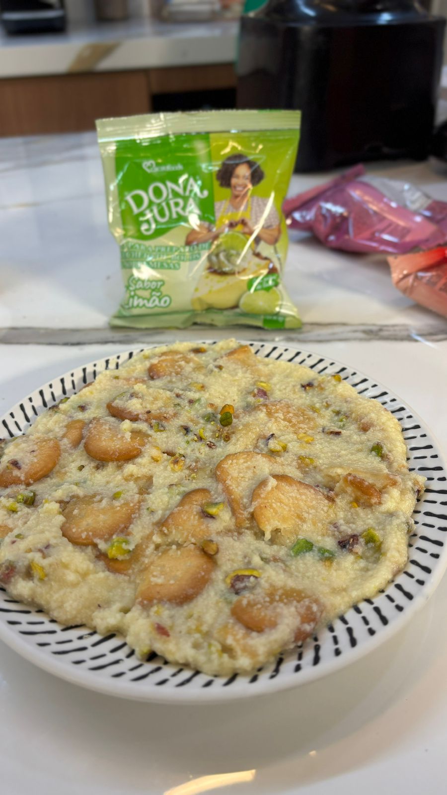 Na panela, coloque o leite condensado, o creme de leite, o pó de limão e leve ao fogo, mexendo sempre, ate comecar a desgrudar a panela. Desligue o fogo e acrescente o pistache e os biscoitos maisena. Misture bem.
