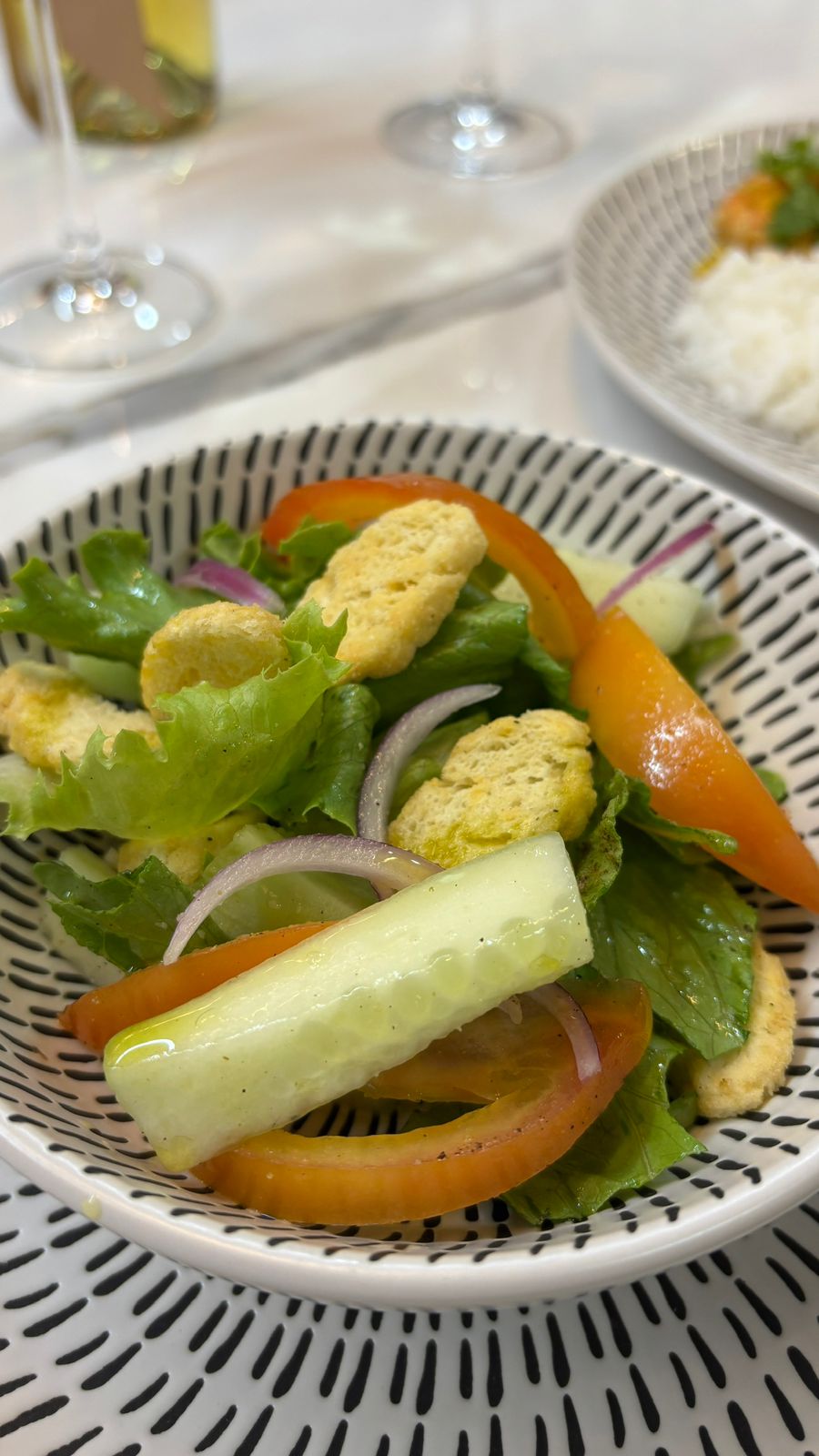 3. Em uma saladeira, misture a alface, o toma-te, os pepinos e os croutons.