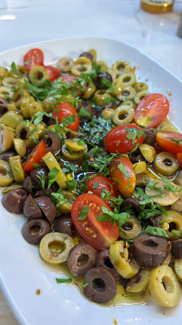 Em um prato de servir coloque as azeitonas, tomate e tempere com voa demais ingredientes. Deixe marinar por 5 minutos antes de servir.