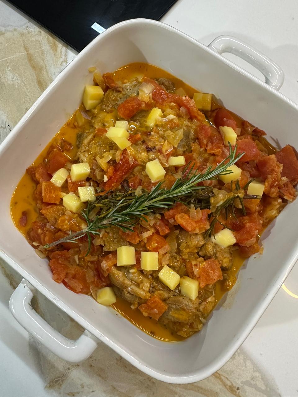 4. Cozinhar: Acrescente o tomate pelado (amassado com as mãos), as ervas e devolva o frango. Abaixe o fogo, tampe a panela e cozinhe por 30 a 50 minutos, até o molho engrossar e a carne ficar macia