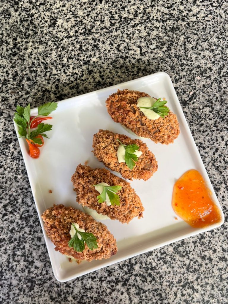Capitão de feijoada frito na Panko com geleia abacaxi com pimenta da Geleis Brasil