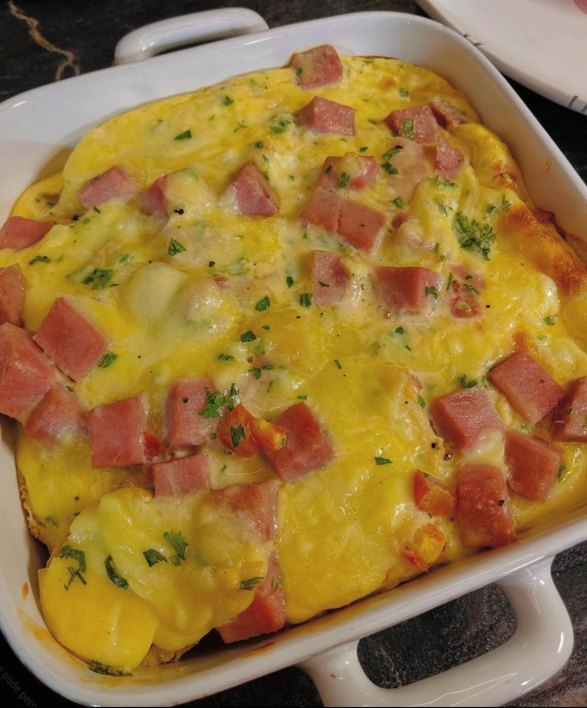 -4 a 6 pães do tipo francês amanhecido -Cerca de 1 xícara de chá de leite (para molhar o pão) - 6 ovos -1 colher de sopa de orégano/ Sal e pimenta-do-reino a gosto - 1 pote de requeijão -2 tomates médios picados - 200 gramas de presunto ralado 300 gramas de queijo mussarela ralada