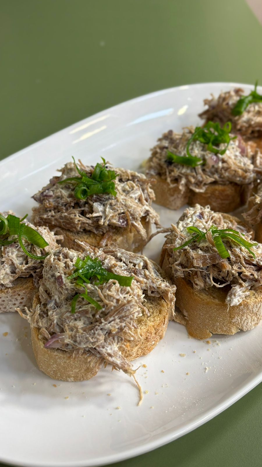 Coloque a carne sobre as torradas e finalize com cebolinha picada.