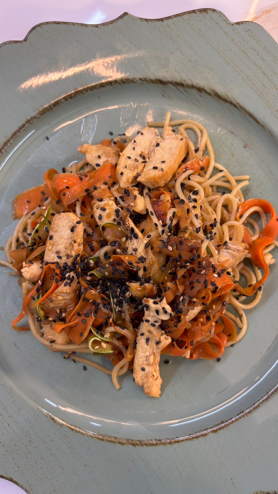 adicionar molho e saltear a massa. Servir com o frango fatiado e finalizar com gergelim e ervas