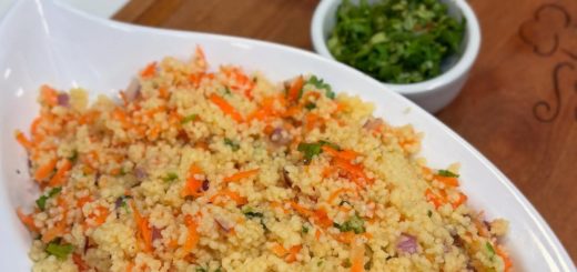 Ingredientes: • 1 xícara de cuscuz marroquino • 1 xícara de água quente com caldo de legumes • 1 colher de sopa de azeite de oliva • Raspas e suco...