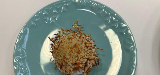 Entradinha de Tapioquinha com carne de sol desfiada, vinagrete e telha de queijo coalho